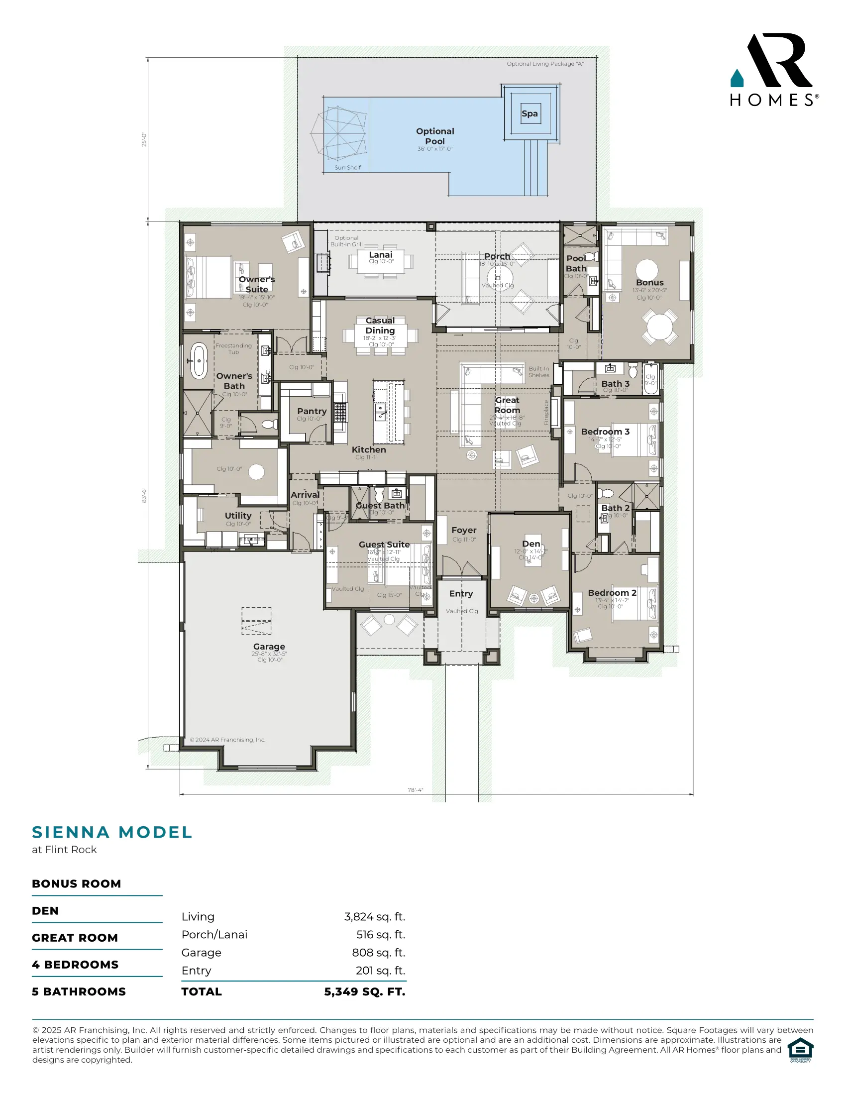 Discover the Sienna, an exceptional custom home with over 5,300 total square feet of meticulously designed space. This stunning home blends elegance, comfort, and functionality throughout 4 spacious bedrooms, 5 luxurious bathrooms, and an expansive great room perfect for entertaining. The open-concept layout connects the gourmet kitchen, casual dining area, and lanai seamlessly, offering the ultimate indoor-outdoor living experience.